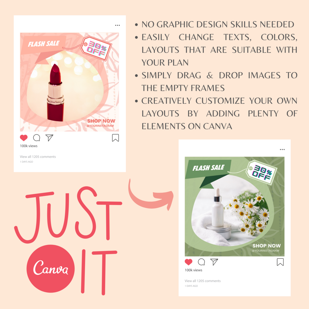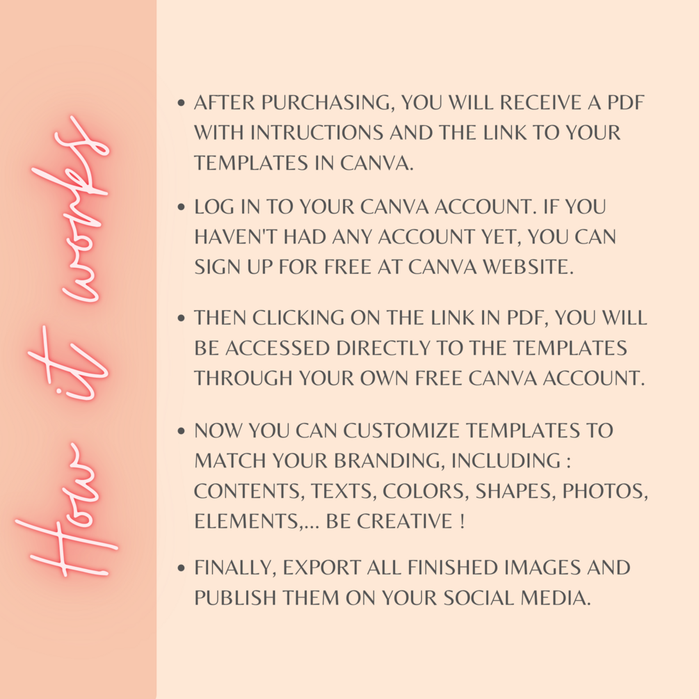 With free Canva account, you can easily customize texts, fonts, colors and use Canva's free graphic sources. You can even add your own images by drag and drop yours picture in the placeholders in my templates. It's so simple ! After that, you just need download and schedule to post them on your social channels.